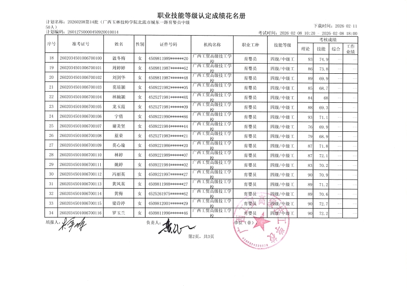 广西工贸高级技工学校关于2026-2-8第14批职业技能等级认定成绩公示