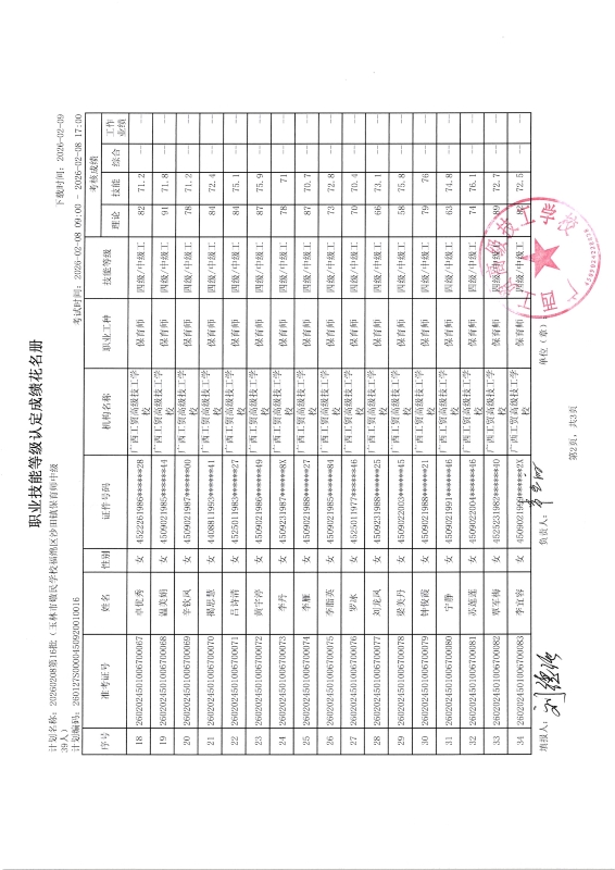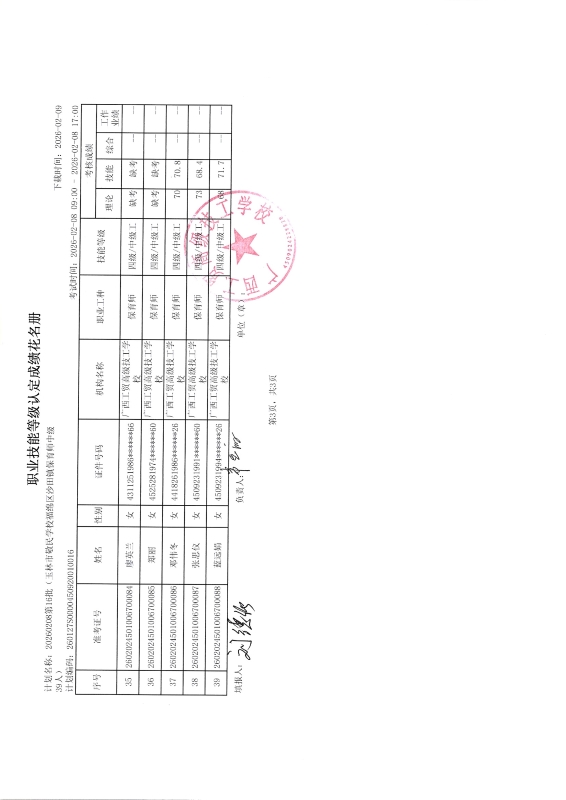 广西工贸高级技工学校关于2026-02-08第15批职业技能等级认定成绩公示