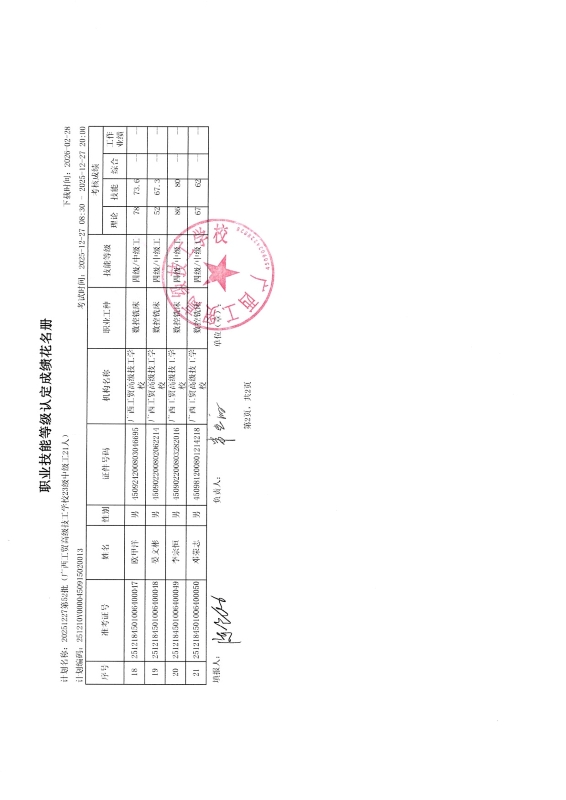广西工贸高级技工学校关于2025-12-27第52批职业技能等级认定成绩公示