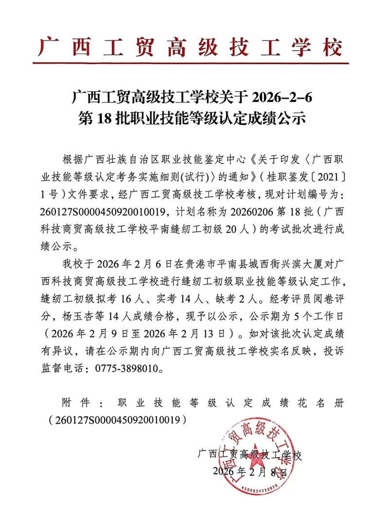 广西工贸高级技工学校关于2026-2-6第18批职业技能等级认定成绩公示