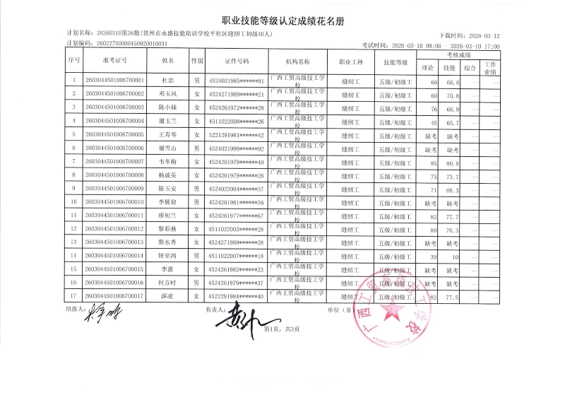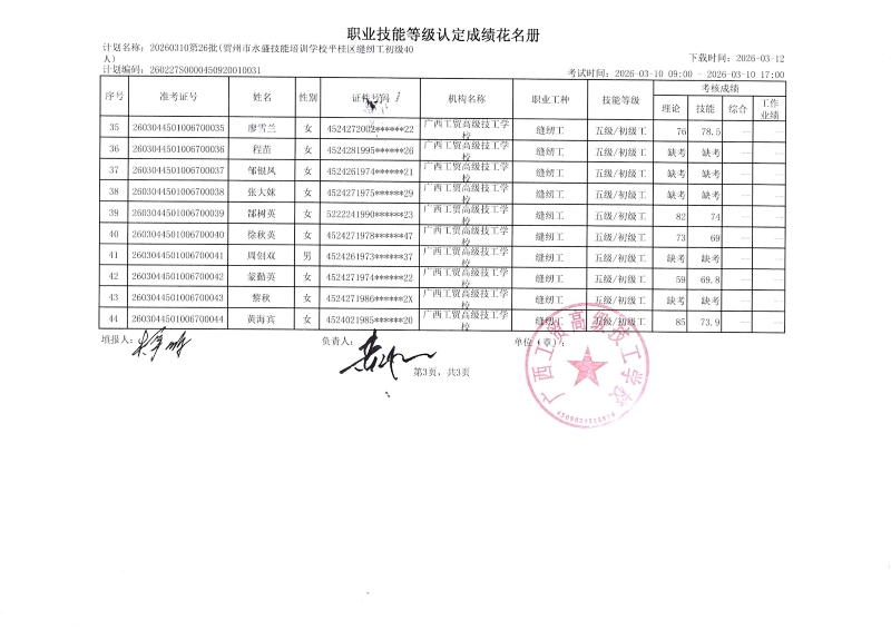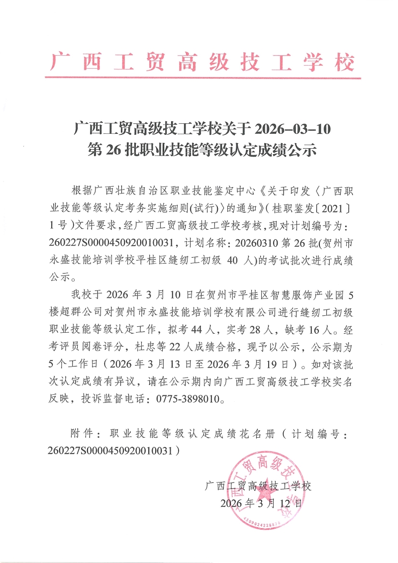 广西工贸高级技工学校关于2026-03-10第26批职业技能等级认定成绩公示