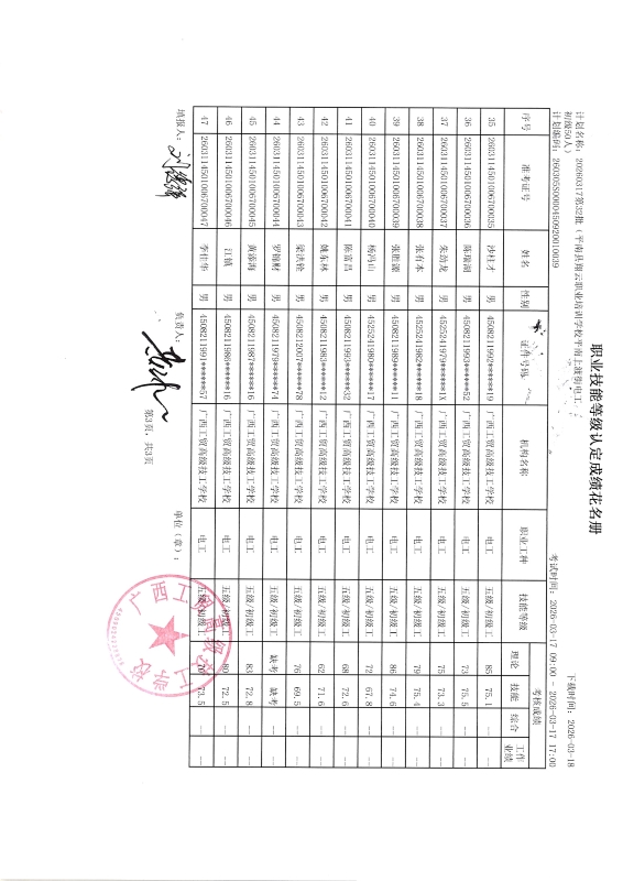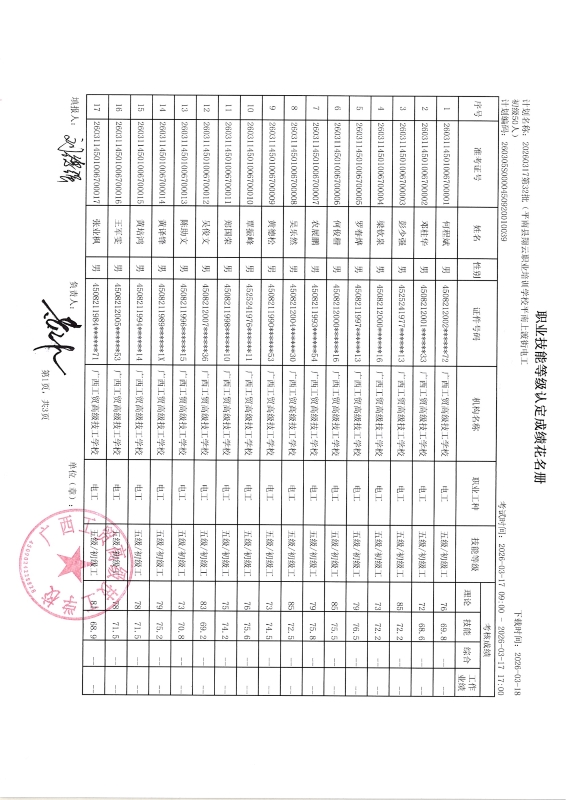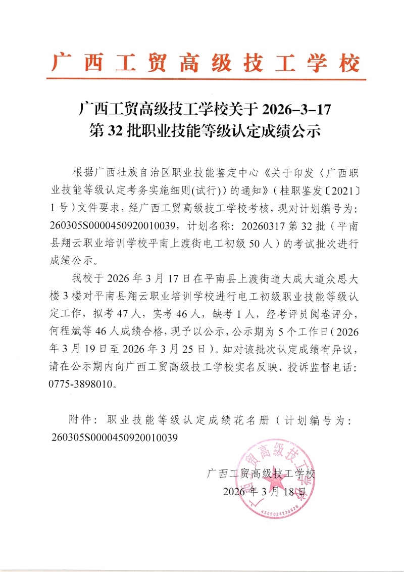 广西工贸高级技工学校关于2026-3-17第32批职业技能等级认定成绩公示