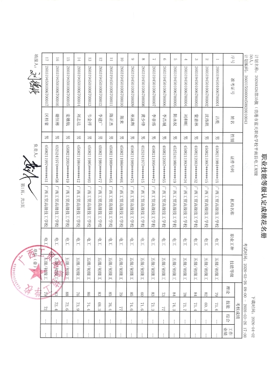广西工贸高级技工学校关于2026-3-27第36批职业技能等级认定成绩公示
