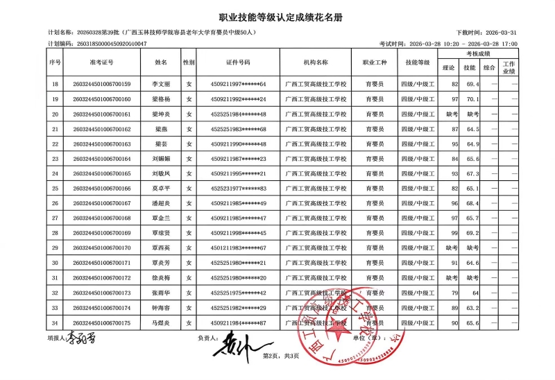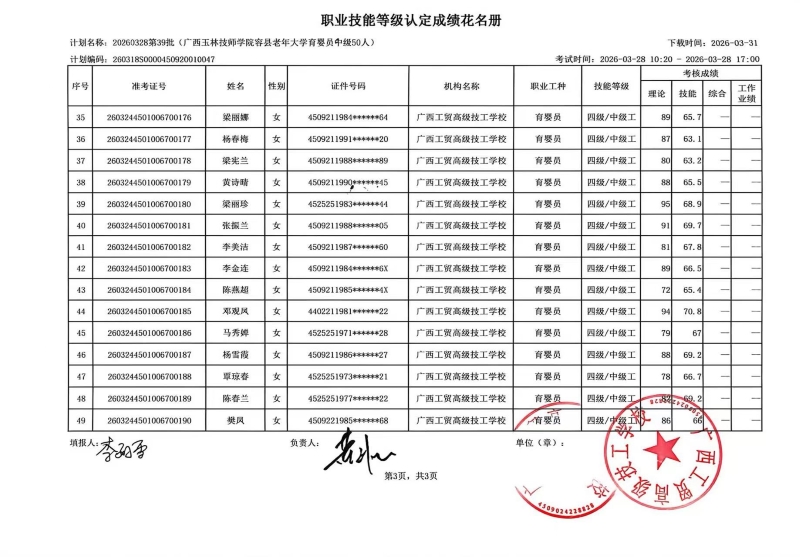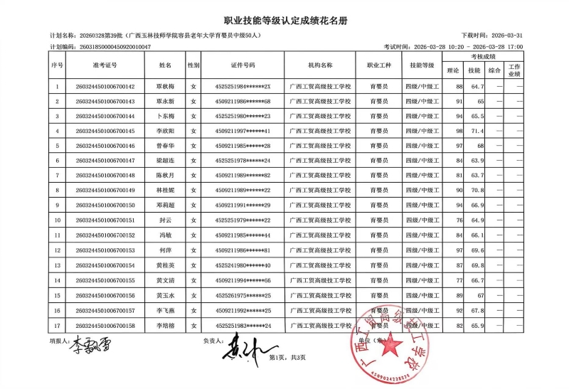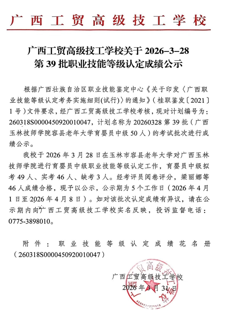 广西工贸高级技工学校关于2026-3-28第39批职业技能等级认定成绩公示