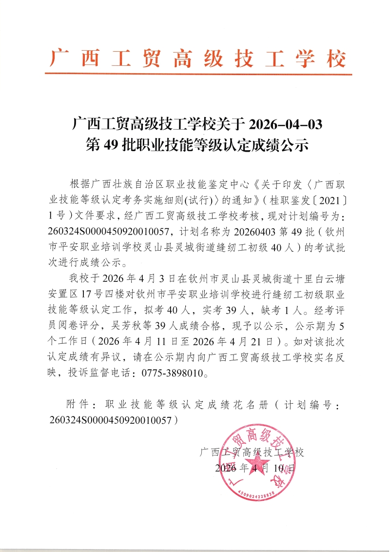 广西工贸高级技工学校关于2026-04-03第49批职业技能等级认定成绩公示