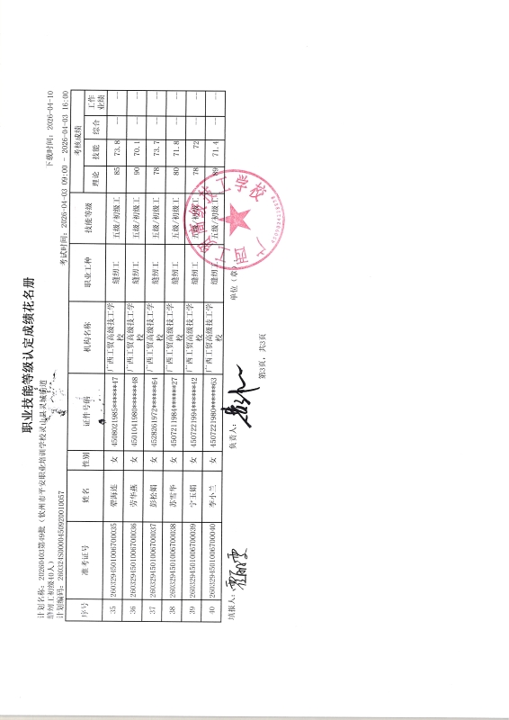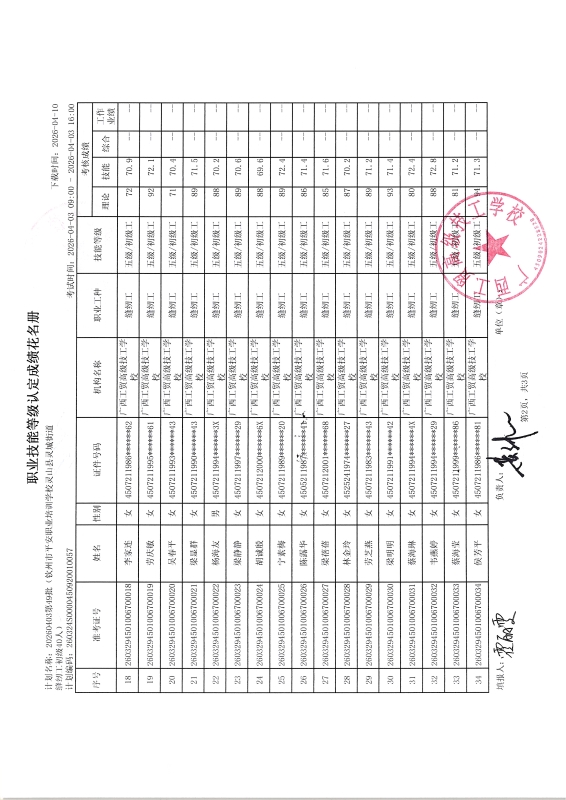 广西工贸高级技工学校关于2026-04-06第50批职业技能等级认定成绩公示