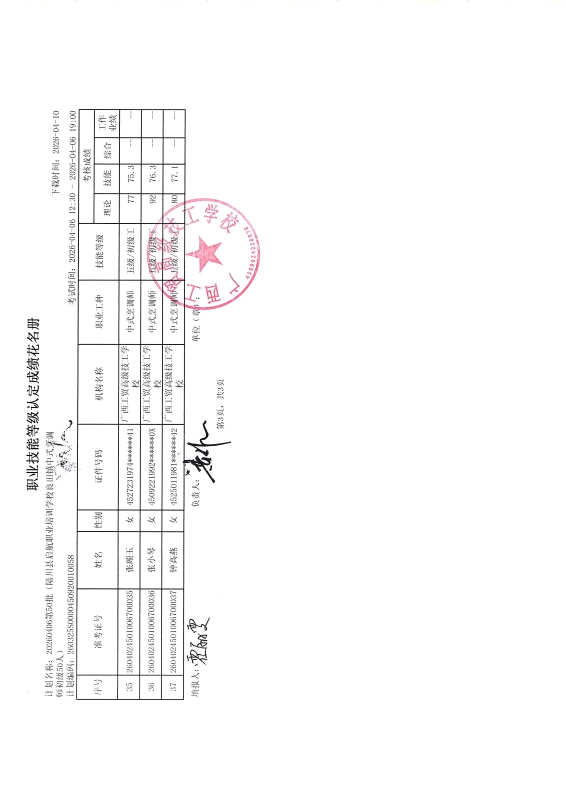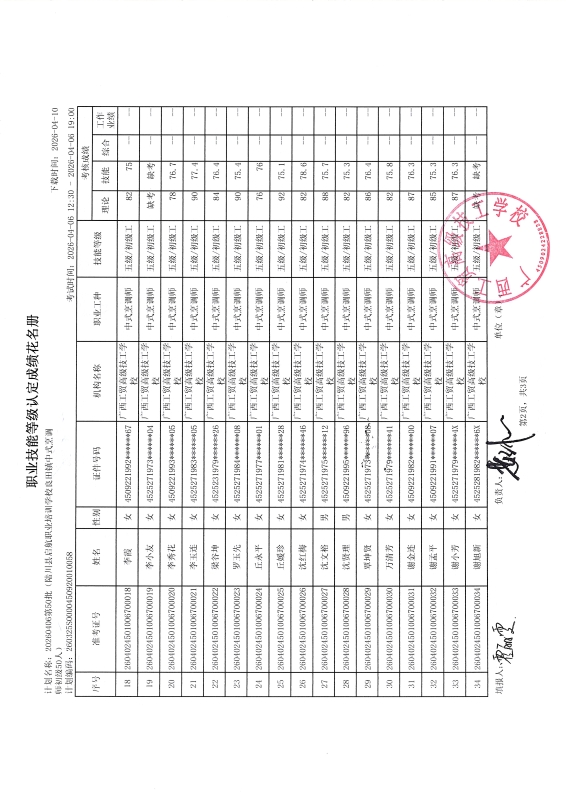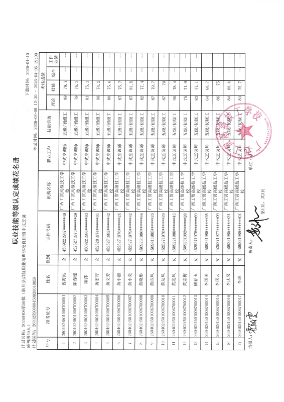 广西工贸高级技工学校关于2026-04-06第50批职业技能等级认定成绩公示