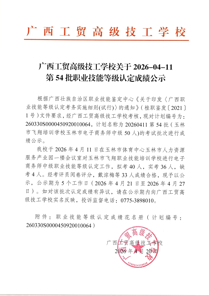 广西工贸高级技工学校关于2026-04-11第54批职业技能等级认定成绩公示