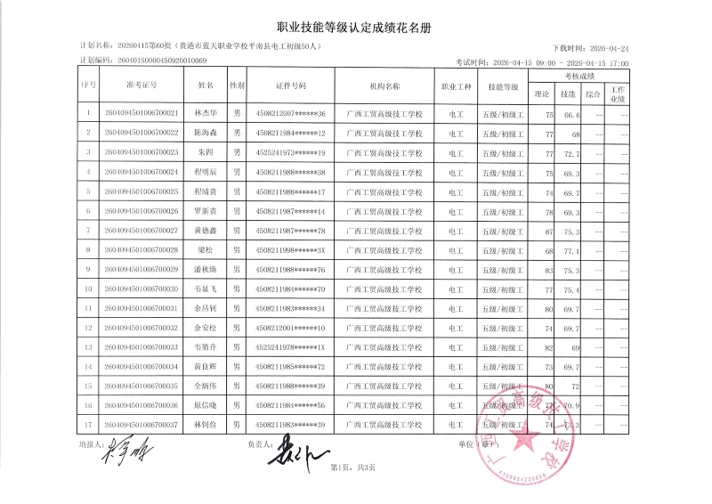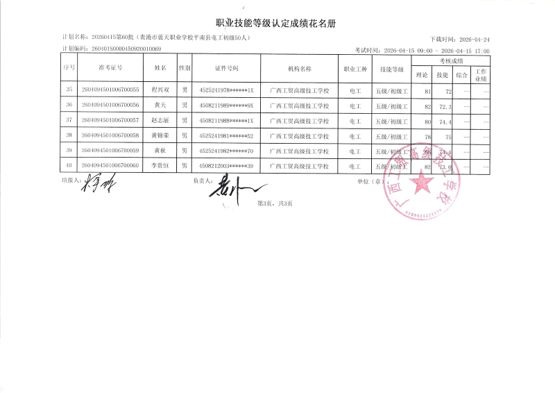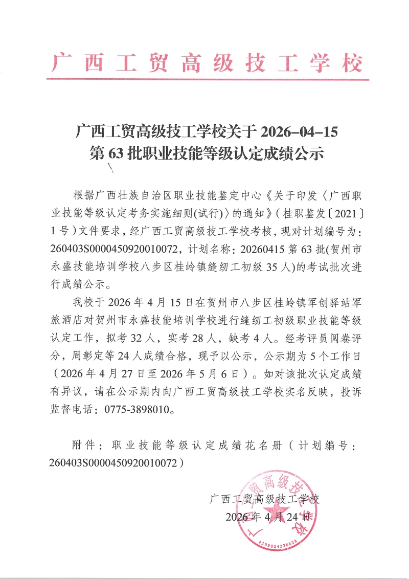广西工贸高级技工学校关于2026-04-15第63批职业技能等级认定成绩公示