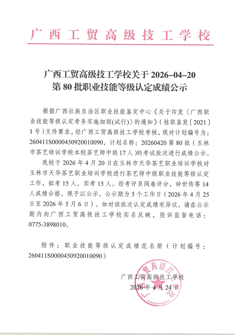 广西工贸高级技工学校关于2026-04-20第80批职业技能等级认定成绩公示