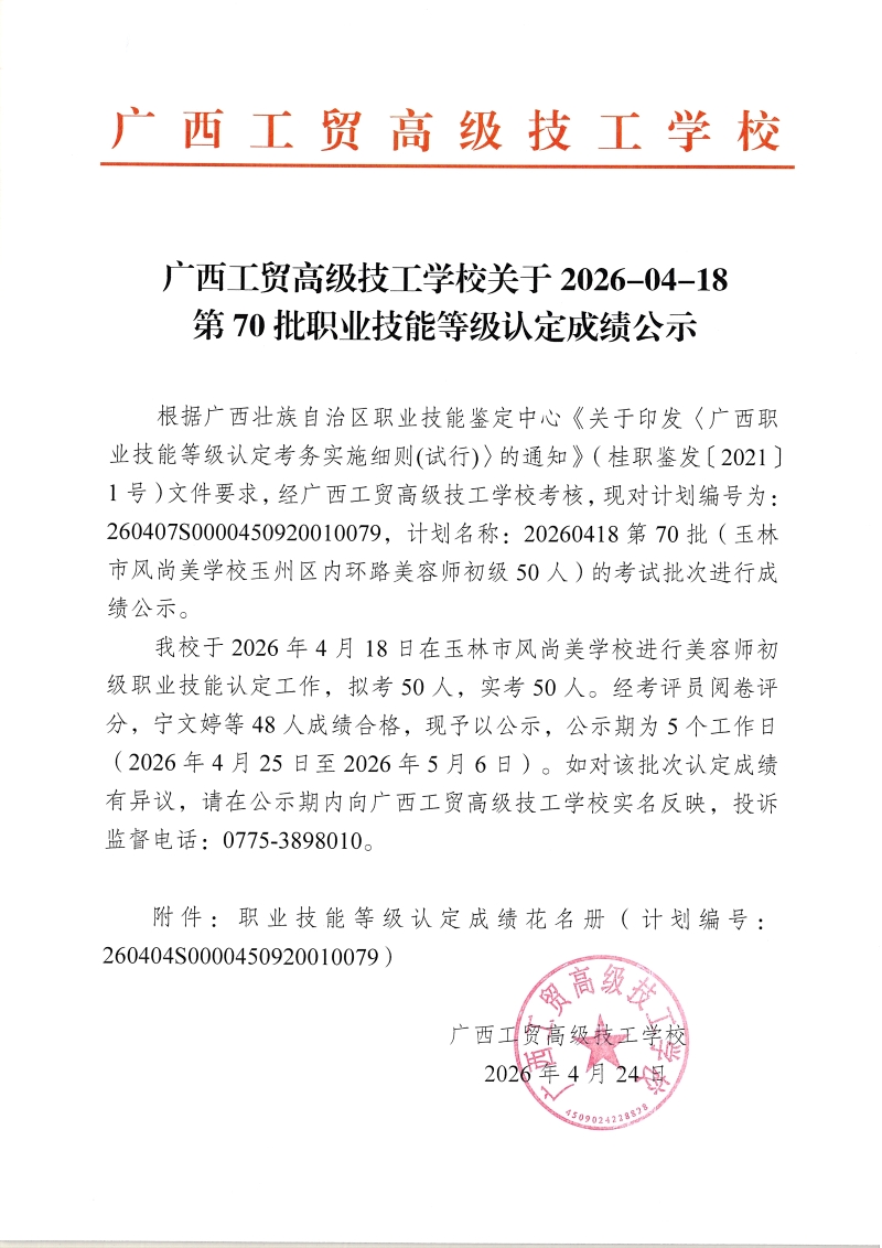 广西工贸高级技工学校关于2026-04-18第70批职业技能等级认定成绩公示