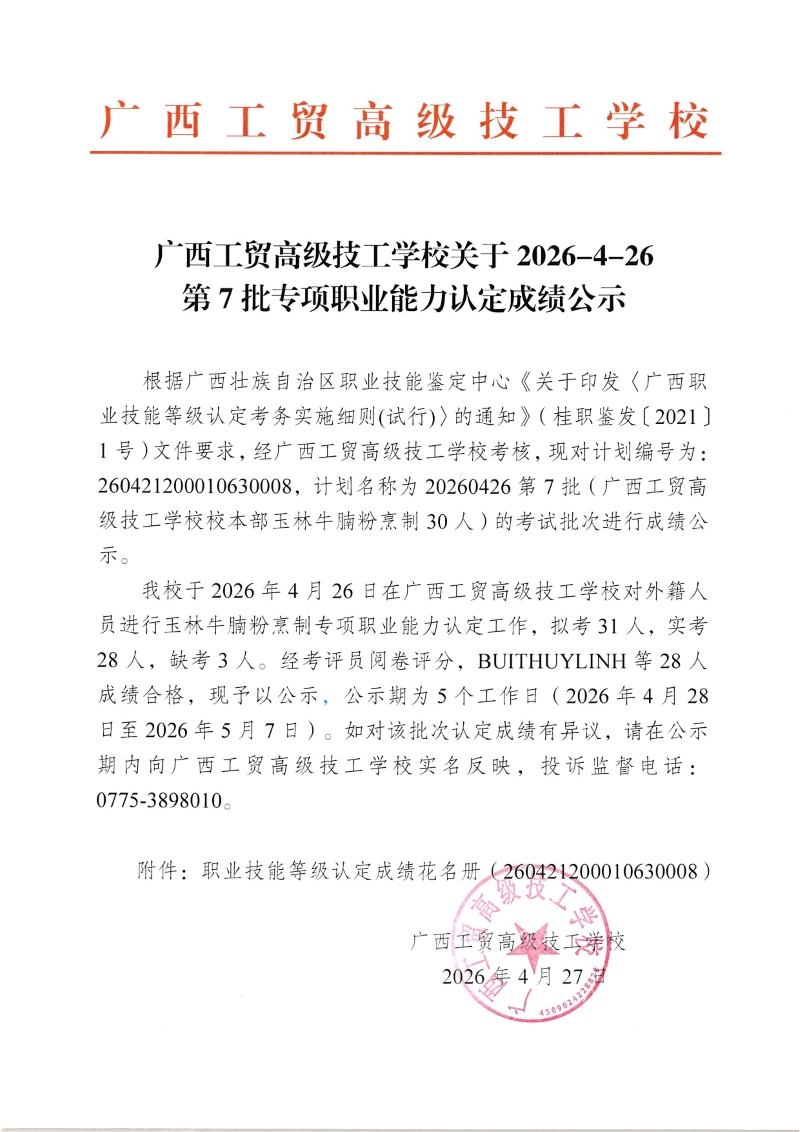 广西工贸高级技工学校关于2026-4-26第7批专项职业能力认定成绩公示