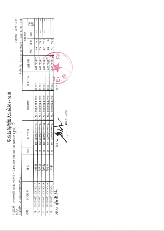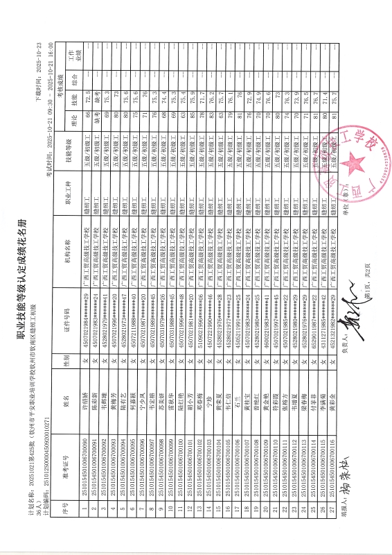 广西工贸高级技工学校关于2025-10-21第425批职业技能等级认定成绩公示