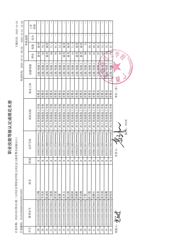 广西工贸高级技工学校关于2025-10-21第421批职业技能等级认定成绩公示