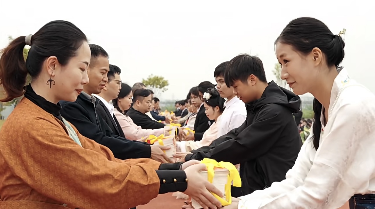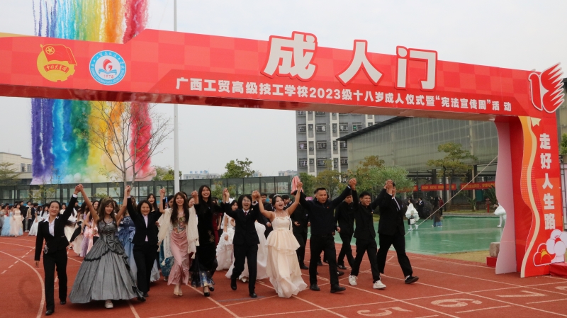 仪式中,2023级班主任向学生赠予《中华人民共和国宪法》读本,师生代表互行揖礼、佩戴成人纪念章。全体学生向师长献花、鞠躬,表达感恩之情。紧接着,全体师生携手跨越"成人门",完成从少年到成人的庄严过渡。这一环节不仅象征着年龄的增长,更意味着公民责任的担当,以及用技术技能回馈社会的开始。