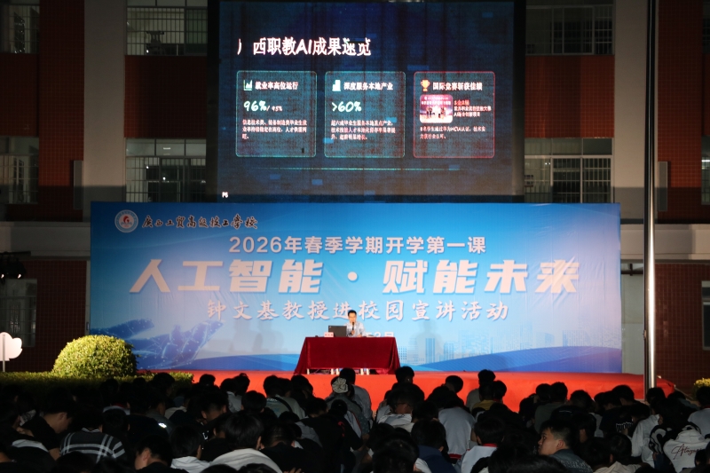 为深入贯彻落实国家“人工智能+”行动战略部署,推动前沿科技与技工教育深度融合,提升学生科技素养与创新意识,3月16日晚,学校举办“人工智能·赋能未来”春季学期“开学第一课”专题宣讲活动,特邀人工智能专家钟文基教授作主题宣讲,为师生带来一堂思想深刻、内容前沿的开学第一课。